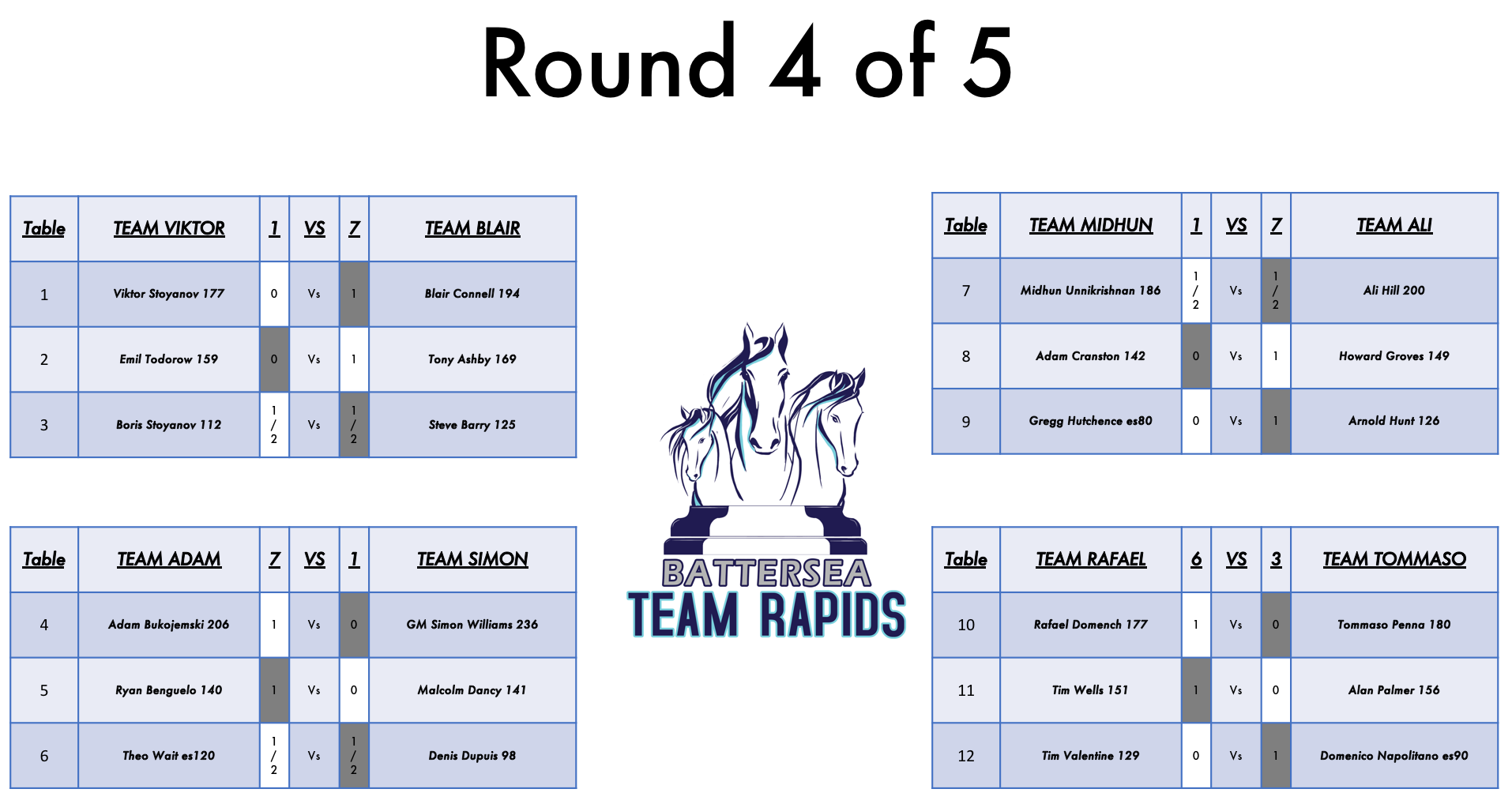Blair scored 4/5 on board 1 and there was 3.5/5 from Tony and an unbeaten 3/5 for Steve. In 15 games the Blair Project only lost two games.